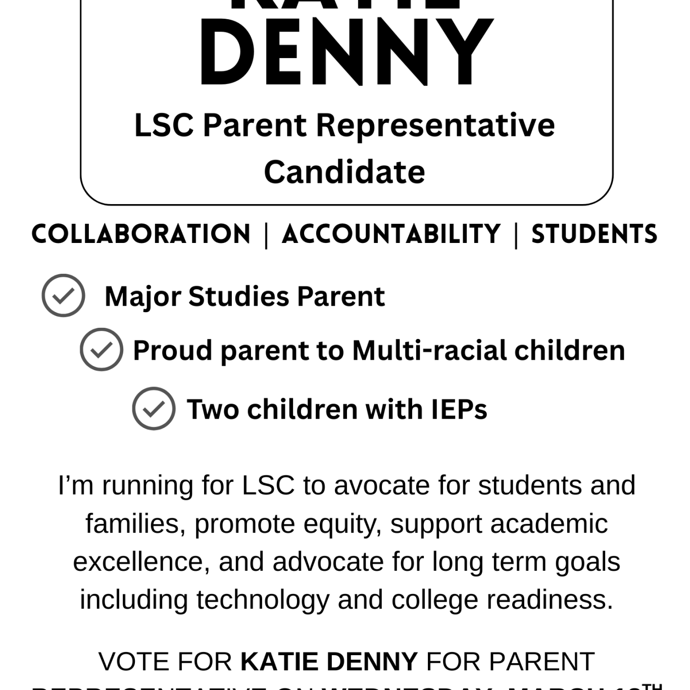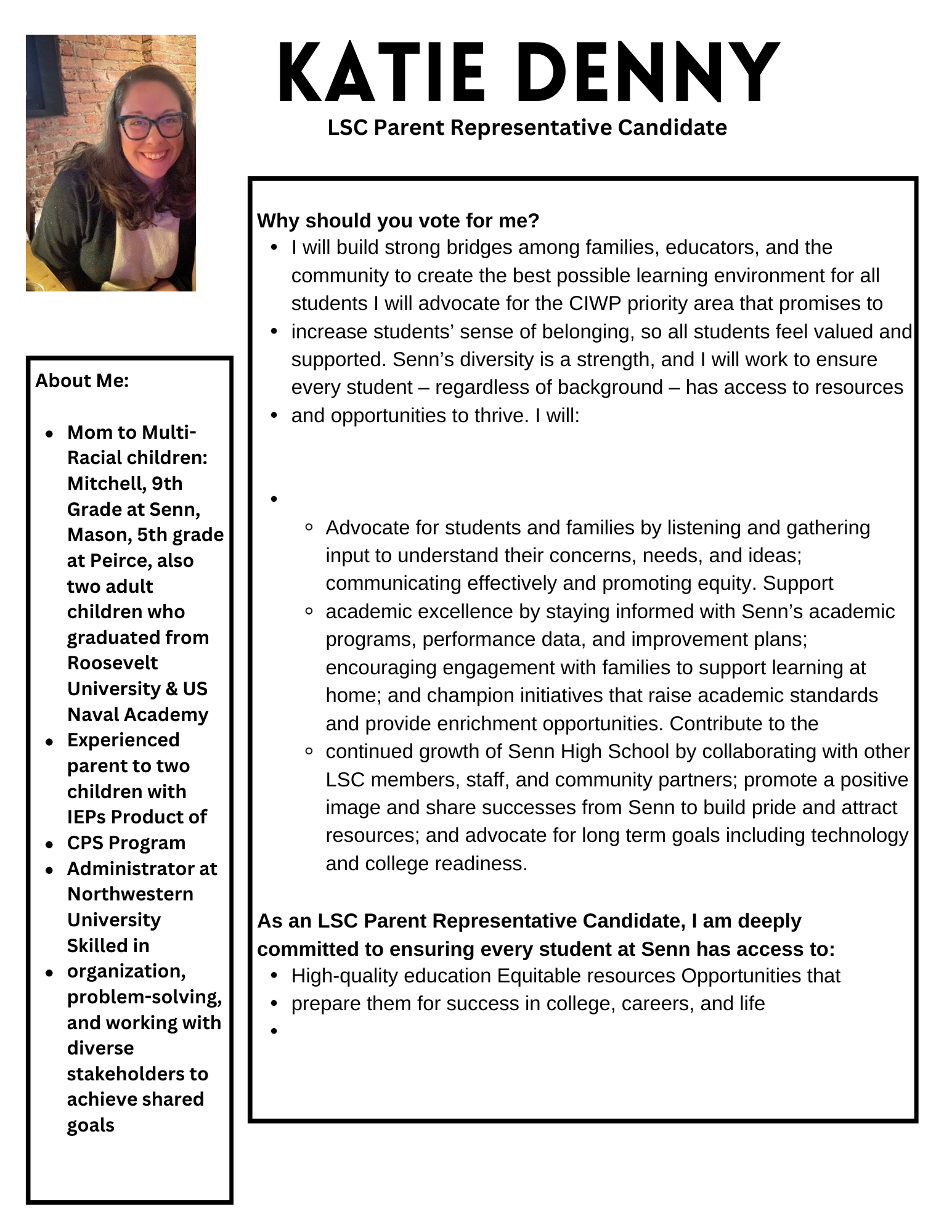 I am a mom to 4 multi-racial children, an experienced parent to two children who are diverse learners, a product of CPS and a program administrator at Northwestern University. I have skills in organization, problem-solving and working with diverse stakeholders to achieve shared goals. I currently serve as the Vice-Chair of the Parent Advisory Council at Senn High School.