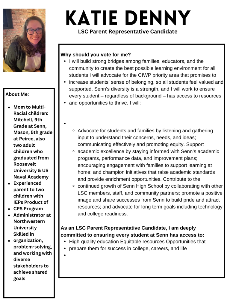 I am committed to ensure every student at Senn has access to high-quality education, equitable resources and opportunities that prepare them for success in college, careers and life. I believe serving as a parent representative on the Senn LSC will enable these goals to be accomplished.